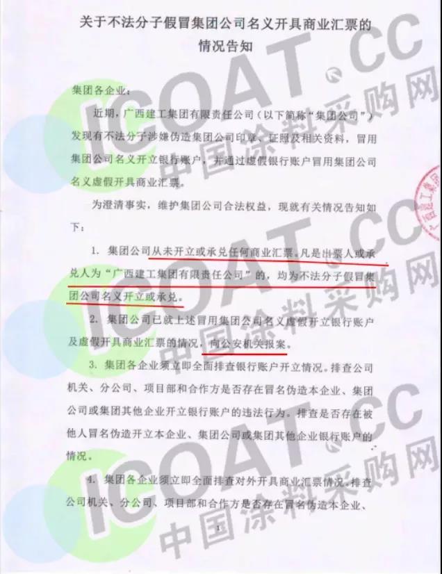 廣西建工集團稱,從未開立或承兌任何商業匯票,凡是出票人或承兌人為“廣西建工集團有限責任公司”的,均為不法分子假冒集團公司名義開立或承兌。目前,就上述冒用集團公司名義虛假開立銀行賬戶及虛假開具商業匯票的情況,廣西建工集團已向公安機關報案。