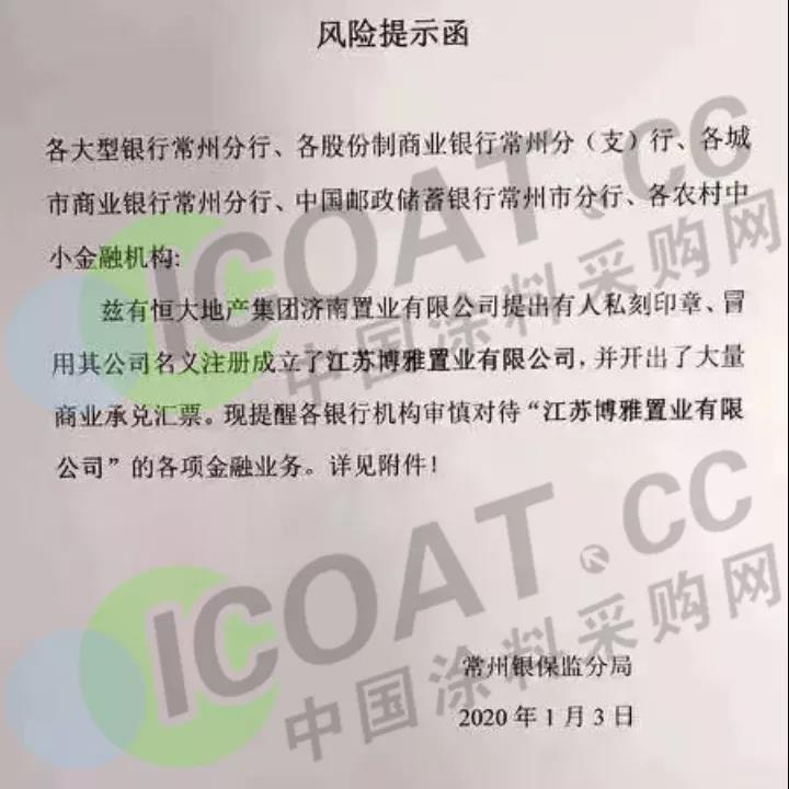 2020年1月,江蘇常州銀保監分局向轄內銀行機構發布風險提示函稱,茲有恒大地產集團濟南置業有限公司提出有人私刻印章、冒用其公司名義注冊成立了江蘇博雅置業有限公司,并開具了大量商業承兌匯票,提醒轄內各銀行機構審慎對待“江蘇博雅置業有限公司”的各項金融業務。說明函同時稱,江蘇博雅置業并非其子公司,江蘇博雅置業所進行的任何行為均與該司無關,該司已于2019年11月6日向江蘇16家銀行寄送了函告,說明了前述情況,但近期該司得知江蘇博雅置業仍然在開具商業承兌匯票。