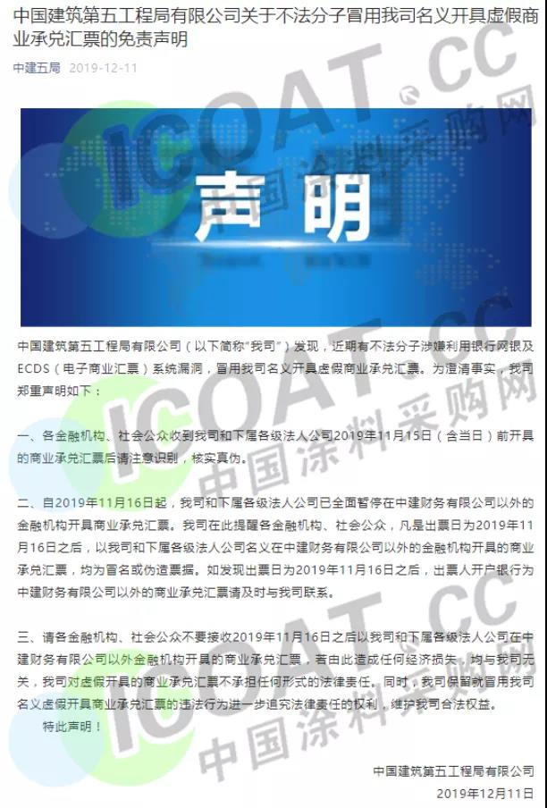 去年中國建筑第五工程局有限公司發布聲明,稱近期有不法分子涉嫌利用銀行網銀及ECDS(電子商業匯票)系統漏洞,冒用名義開具虛假商業承兌匯票。為澄清事實,鄭重聲明,凡是出票日為2019年11月16日之后,以我司和下屬各級法人公司名義在中建財務有限公司以外的金融機構開具的商業承兌匯票,均為冒名或偽造票據,請各金融機構、社會公眾不要接收。