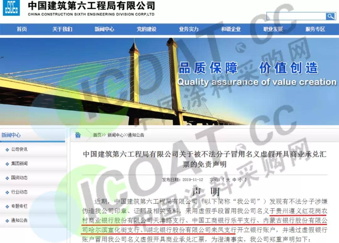 中國建筑第六工程局有限公司(中建六局)在其官網上發表聲明稱,發現有不法分子涉嫌為造該公司證照,于貴州遵義紅花崗農村商業銀行股份有限公司天津路支行、中國工商銀行樂平支行、內蒙古銀行股份有限公司哈爾濱宣化街支行、湖北銀行股份有限公司來鳳支行開立銀行賬戶,虛假開具商業承兌匯票。