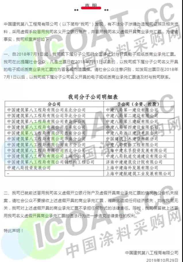 2019年10月,中國建筑第八工程局有限公司發布聲明稱,有不法分子涉嫌偽造中建八局證照及相關資料,采用虛假手段冒用中建八局名義開立銀行賬戶,并冒用八局名義虛假開具商業承兌匯票,自2018年7月1日起,中建八局或下屬分子公司已全面停止對外開具電子或紙質商業承兌匯票。