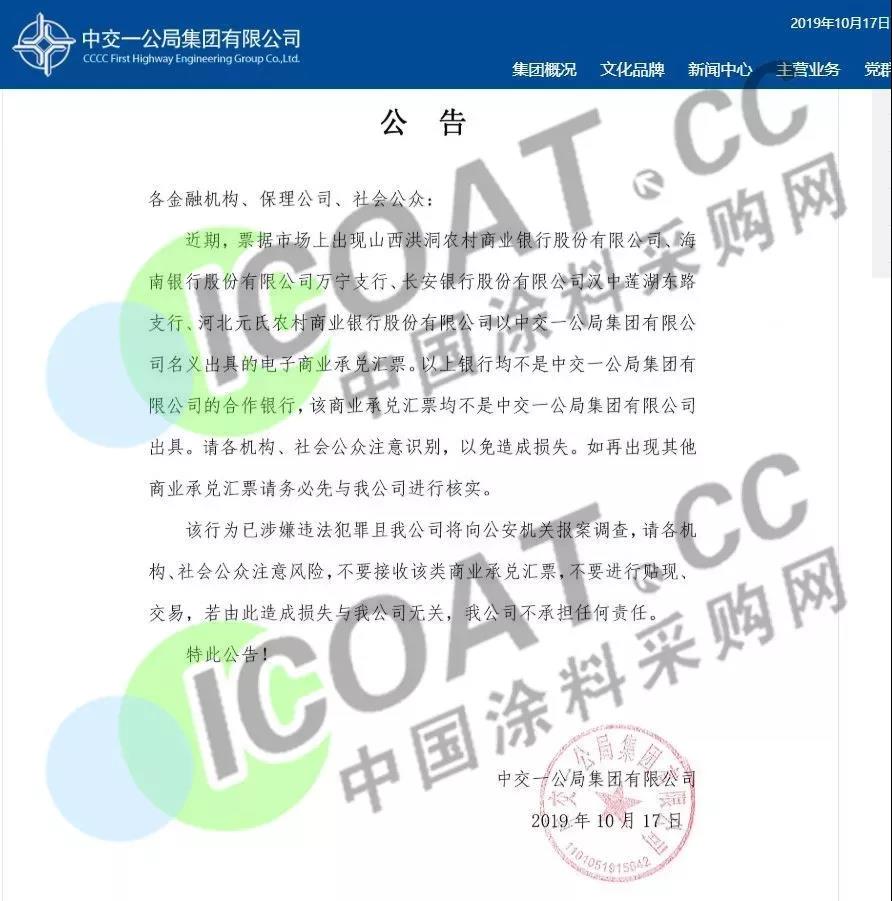 2019年8月,中交一公局集團有限公司發布公告稱,票據市場上出現山西洪洞農村商業銀行股份有限公司、海南銀行股份有限公司萬寧支行、長安銀行股份有限公司漢中蓮湖東路支行、河北元氏農村商業銀行股份有限公司以中交一公局集團有限公司名義出具的電子商業承兌匯票。以上銀行均不是中交一公局集團有限公司的合作銀行,該商業承兌匯票均不是中交一公局集團有限公司出具。該行為已涉嫌違法犯罪且我公司將向公安機關報案調查,請各機構、社會公眾注意風險,不要接收該類商業承兌匯票,不要進行貼現、交易。