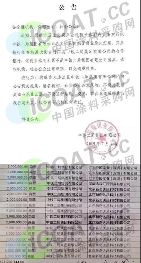2019年7月,中鐵二局發布公告,稱近期票據市場上出現興業銀行長春前進大街支行以中鐵二局集團有限公司名義出具的電子商業承兌匯票,興業銀行長春前進大街支行不是中鐵二局集團有限公司的合作銀行,該商業承兌匯票不是中鐵二局集團有限公司出具。