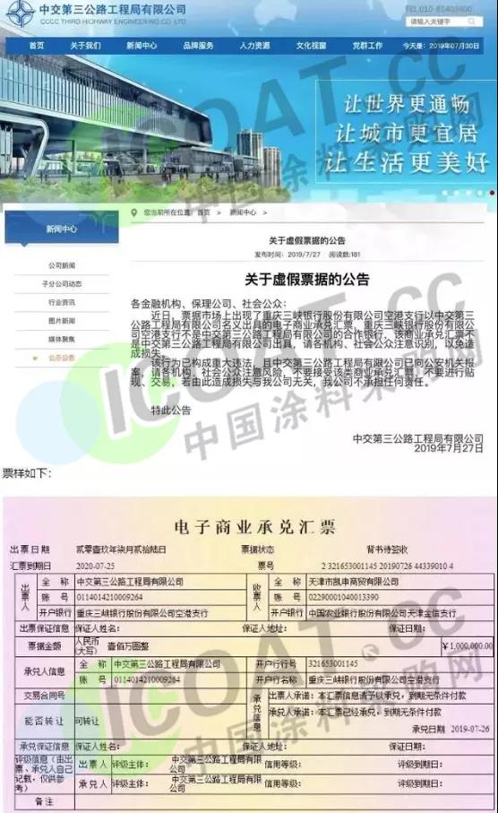 2019年7月,中交第三公路工程局有限公司發布公告稱,近日票據市場上出現了重慶三峽銀行股份有限公司空港支行以中交第三公路工程局有限公司名義出具的電子商業承兌匯票,重慶三峽銀行股份有限公司空港支行不是中交第三公路工程局有限公司的合作銀行。該商業承兌匯票不是中交第三公路工程局有限公司出具。中交第三公路工程局有限公司已向公安機關報案,請各機構、社會公眾注意風險,不要接受該類商業承兌匯票、不要進行貼現、交易。