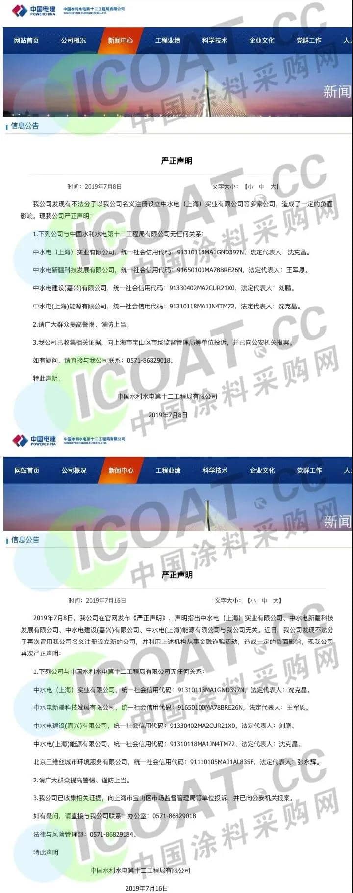 2019年7月,中國水利水電第十二工程局有限公司連續發布聲明,其發現被人冒充名義注冊設立“中水電(上海)實業有限公司”等多家公司并開出票據造成負面影響。