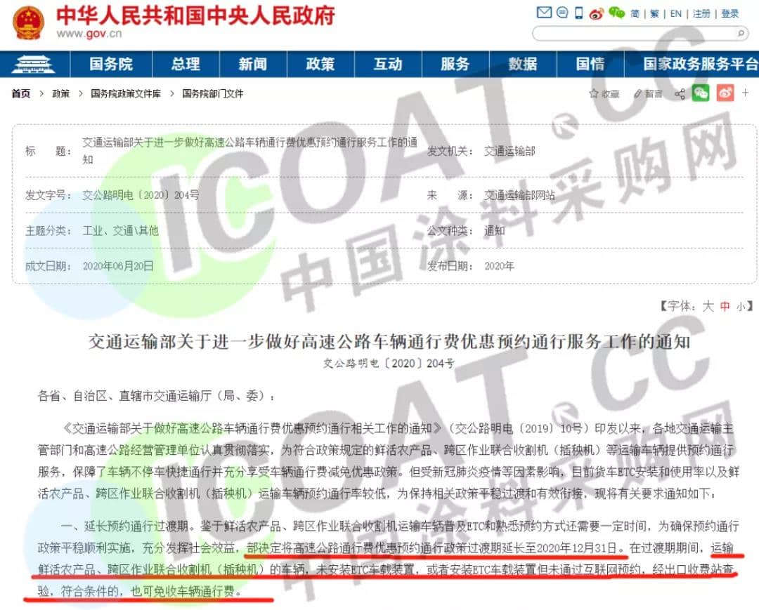 一、延長預約通行過渡期。鑒于鮮活農產品、跨區作業聯合收割機運輸車輛普及ETC和熟悉預約方式還需要一定時間,為確保預約通行政策平穩順利實施,充分發揮社會效益,部決定將高速公路通行費優惠預約通行政策過渡期延長至2020年12月31日。在過渡期期間,運輸鮮活農產品、跨區作業聯合收割機(插秧機)的車輛,未安裝ETC車載裝置,或者安裝ETC車載裝置但未通過互聯網預約,經出口收費站查驗,符合條件的,也可免收車輛通行費。