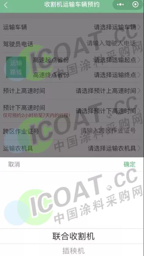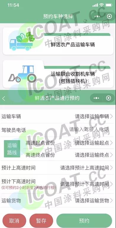 駕駛人通過微信小程序進入中國ETC服務進行預約,然后根據自己運輸的產品,選擇鮮活農產品運輸車輛或者運輸聯合收割機(包括插秧機),然后按提示操作。