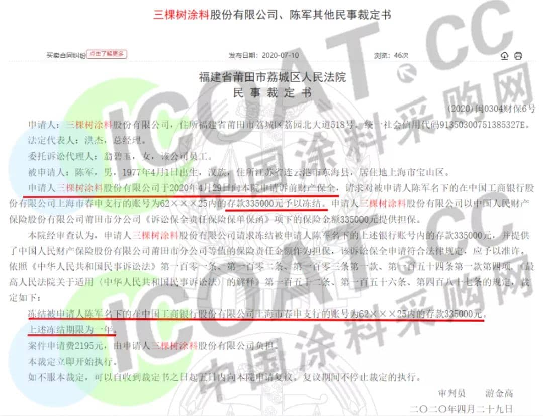 然而,據涂料采購網了解,在福建省莆田市荔城區人民法院作出(2020)閩0304民初1916號裁定之前,早在2020年4月29日,三棵樹涂料股份有限公司向福建省莆田市荔城區人民法院申請訴前財產保全,對被申請人陳軍名下的中國工商銀行股份有限公司上海市春申支行的帳號62XXX25內的存款335000元提供擔保。