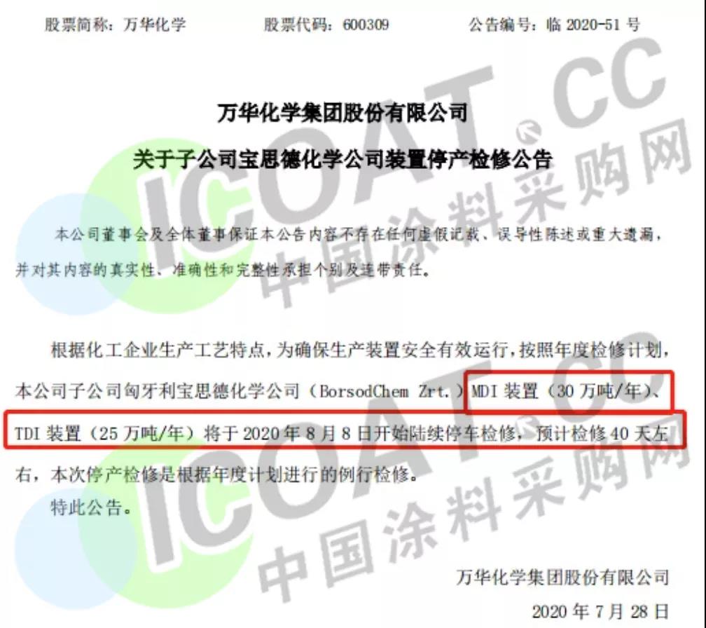 疊加近日巴斯夫宣布其位于路易斯安那州蓋斯馬爾的產能為16萬噸/年的甲苯二異氰酸酯(TDI)工廠遭遇不可抗力,對于正常生產也會造成影響。業內人士表示,目前國內MDI、TDI的需求正在不斷增加,檢修加劇了原料市場的供應緊張,但圈內龍頭企業的停車檢修讓市場看漲氣氛濃厚。