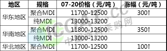 不少企業MDI封盤,華東地區聚合MDI報價上調300元/噸,華東地區聚合MDI報價上調350元/噸,華北地區聚合MDI報價上調100元/噸。