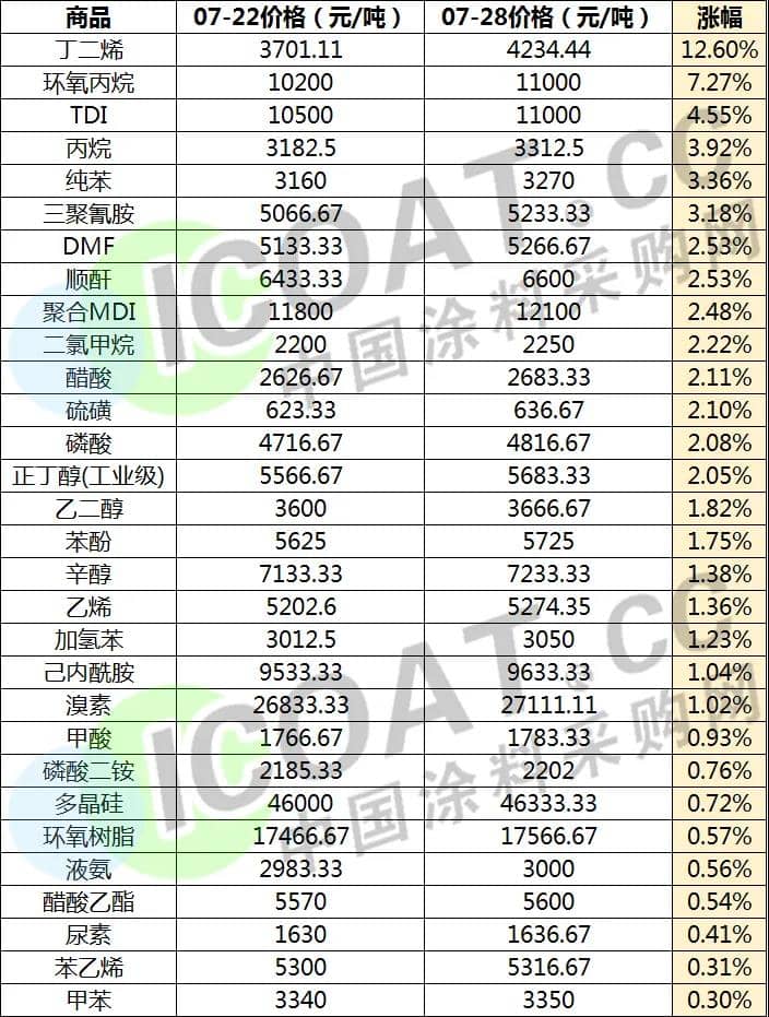據涂料采購網不完全統計,在較為重要的84種化工原材料中,有30種處于上漲趨勢,其中丁二烯(12.6%)、環氧丙烷(7.27%)、TDI(4.55%)位于漲幅榜前三位,丙烷、純苯、三聚氰胺、聚合MDI等27種原材料漲幅在5%以下。