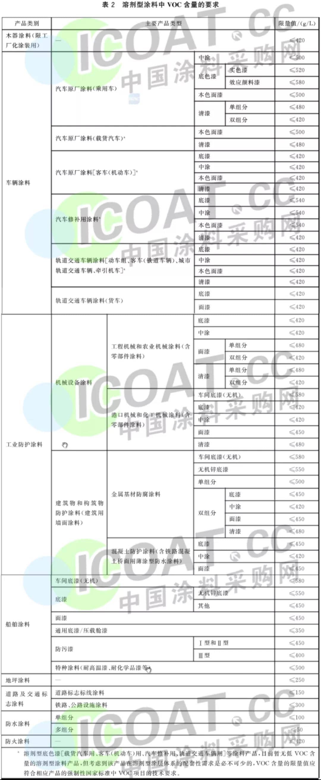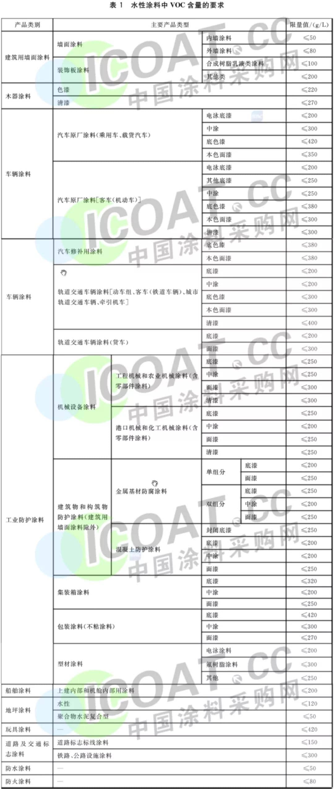 100多種涂料VOC限值情況如下表所示: