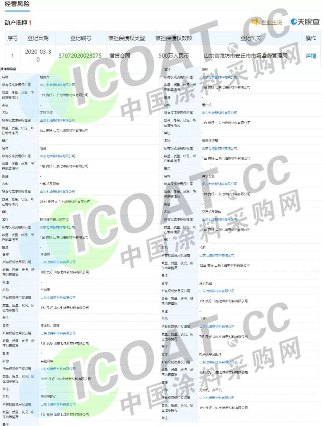 據涂料采購網了解,今年3月30日,七維水漆因為借貸合同,將抵押物以500萬元的債權數額抵押給安丘市濰安水務有限公司,抵押物包括不銹鋼筒、電纜、分散機及配件、烤漆房、實驗設備、噴涂機、噴嘴、拉缸、砂磨機、空壓機等多個種類的物品。這不禁讓人猜測,是否七維水漆資金鏈存在斷裂風險,才用動產抵押來緩和資金方面的問題。