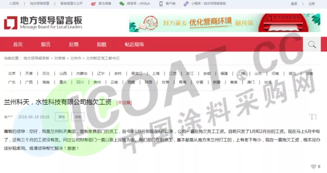 地方領導留言板顯示,某蘭州科天集團定制家具部門的員工稱,蘭州科天集團財務部門以賬上沒錢為由,一直拖欠員工工資,目前他上有老下有小根本無法補貼家用。