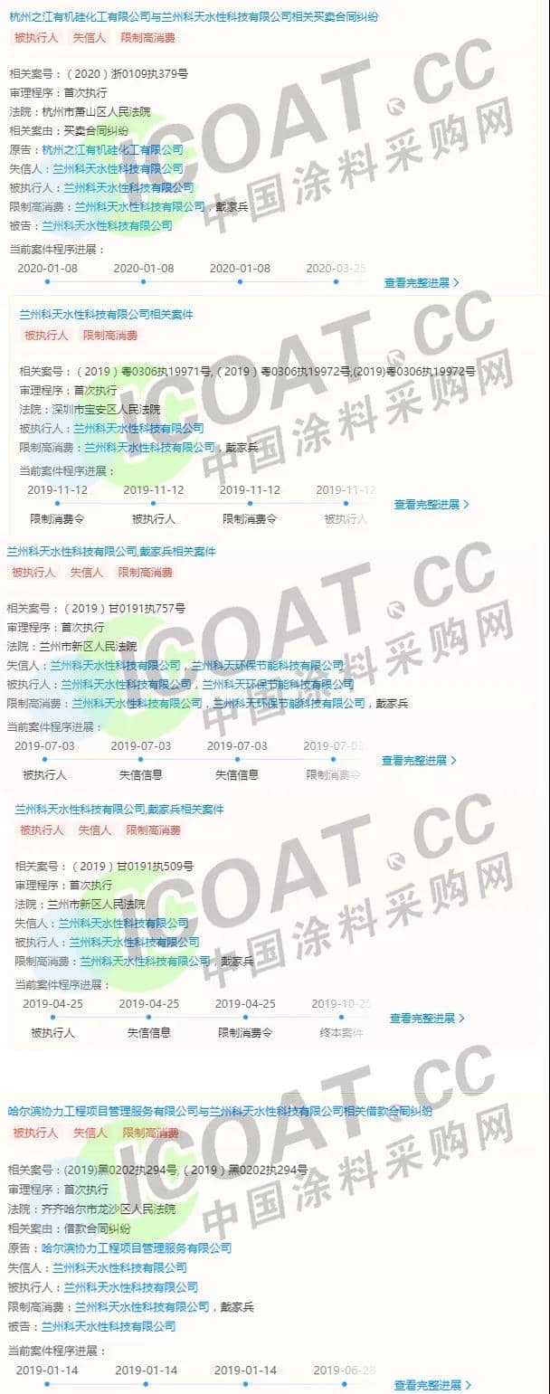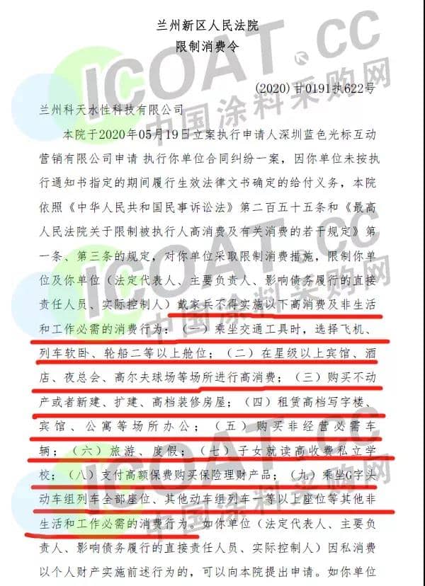 2020年5月19日,蘭州新區人民法院對水性科天負責人戴家兵采取了限制消費措施。