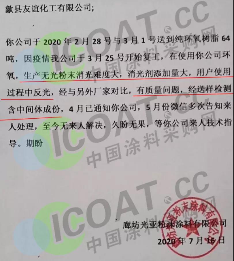 近日,廊坊光亞粉末涂料有限公司對樹脂企業歙縣友誼化工有限公司發函稱,歙縣友誼化工2月28號與3月1號送到64噸環氧樹脂,在使用過程中,生產無光粉末消光難度大,消光劑添加量大,用戶使用過程中反光的問題,經與另外廠家對比,有質量問題,經送檢測含中間體成分。廊坊光亞還表示,4月已通知歙縣友誼化工,5月微信多次告知來人處理,至今無人解決。