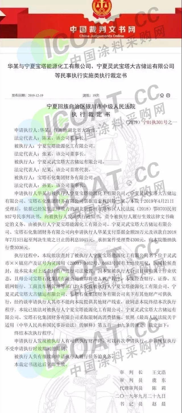 2019年12月20日,記者自裁判文書網獲悉,寧夏回族自治區銀川市中級人民法院于今年9月作出了(2019)寧01執301號之一執行裁定,該文書顯示,寶塔石化集團有限公司即將進入破產程序,寶塔石化集團財務有限公司等名下已無其他財產可供執行。