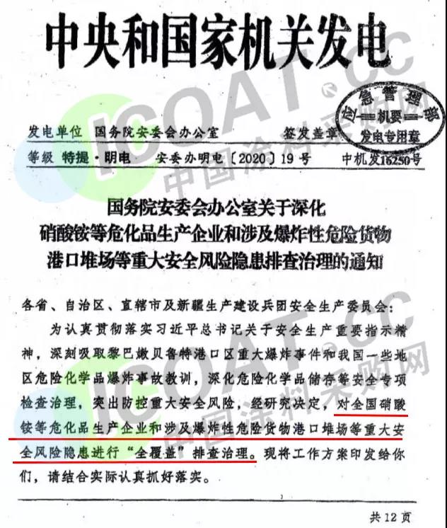 《治理工作方案》稱,為認真貫徹落實關于安全生產重要指示精神,深刻吸取黎巴嫩貝魯特港口區重大爆炸事件和我國一些地區危險化學品爆炸事故教訓,深化危險化學品儲存等安全專項檢查治理,突出防控重大安全風險,經研究決定,對全國硝酸銨等危化品生產企業和涉及爆炸性危險貨物港口堆場等重大安全風險隱患進行“全覆蓋”排查治理。