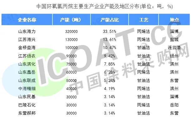 據(jù)公開資料,環(huán)氧氯丙烷產(chǎn)能主要分布在山東和江蘇二省,其中山東海力、江蘇海興、金橋益海三家企業(yè)產(chǎn)能合計(jì)55萬噸,占全國(guó)總產(chǎn)能比例為58%。目前山東海力32萬噸環(huán)氧氯丙烷裝置處于停產(chǎn)整治狀態(tài),重啟時(shí)間尚不確定。