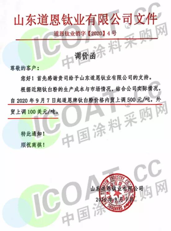7日,山東道恩鈦業(yè)有限公司發(fā)布調(diào)價函,稱自9月7日起道恩牌鈦白粉價格內(nèi)貿(mào)上調(diào)500元/噸,外貿(mào)上調(diào)100美元/噸。據(jù)涂料采購網(wǎng)了解,這是繼7月10日、8月6日發(fā)函后,道恩鈦業(yè)開啟的第三輪漲價。至此,下半年道恩牌鈦白粉內(nèi)貿(mào)價格累計上調(diào)1500元/噸,外貿(mào)價格累計上調(diào)260美元/噸。