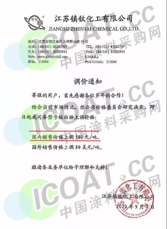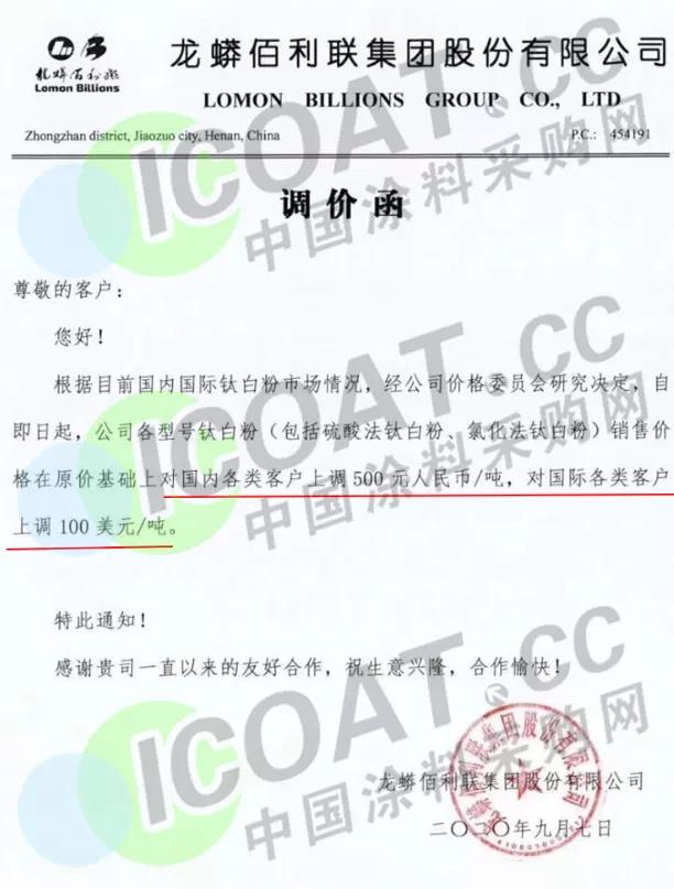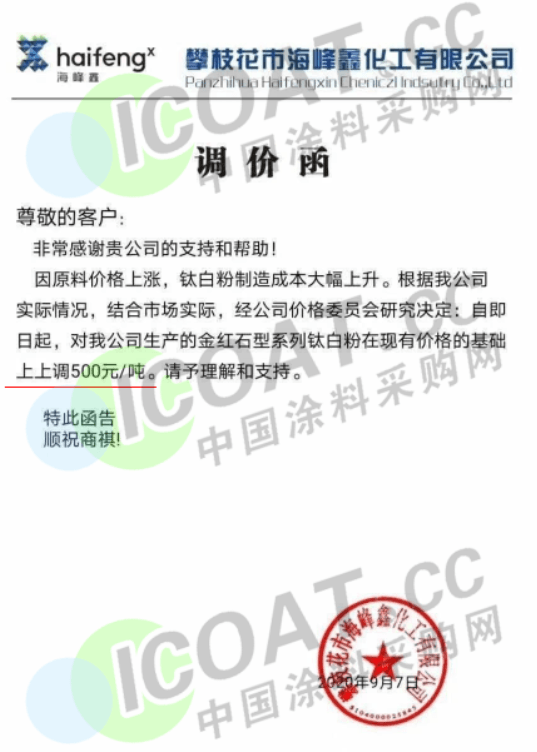 7日,攀枝花市鈦海科技有限責任公司發(fā)布調(diào)價函,稱自2020年9月7日起價格變更如下:鈦海金紅石型鈦白粉內(nèi)貿(mào)價格上調(diào)人民幣500元/噸,外貿(mào)價格上調(diào)100美元/噸;鈦海銳鈦型鈦白粉THA2000、鼎星銳鈦型鈦白粉PDA1000內(nèi)貿(mào)價格上調(diào)人民幣500元/噸,外貿(mào)價格上調(diào)100美元/噸。此前其曾于7月10日、8月7日分別發(fā)布兩次漲價函,此次是第三輪漲價。鈦海金紅石型鈦白粉內(nèi)貿(mào)價格累計上調(diào)1500元/噸,外貿(mào)價格累計上調(diào)260美元/噸。鈦海銳鈦型鈦白粉THA2000、鼎星銳鈦型鈦白粉PDA1000內(nèi)貿(mào)價格上調(diào)人民幣1000元/噸,外貿(mào)價格上調(diào)180美元/噸。