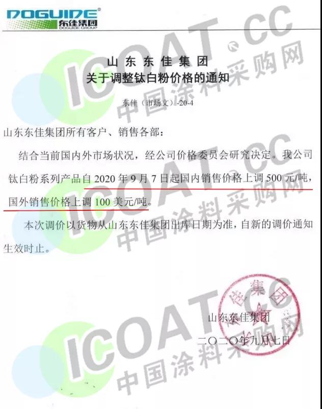 7日,山東東佳集團發(fā)布調(diào)價函,稱自9月7日起,鈦白粉系列產(chǎn)品國內(nèi)銷售價格上調(diào)500元/噸,國外銷售價格上調(diào)100美元/噸。這是繼7月10日、8月10日兩次發(fā)函漲價后,開啟的第三輪漲價,下半年鈦白粉系列產(chǎn)品國內(nèi)價格累計上調(diào)1500元/噸,國外銷售價格上調(diào)260美元/噸。
