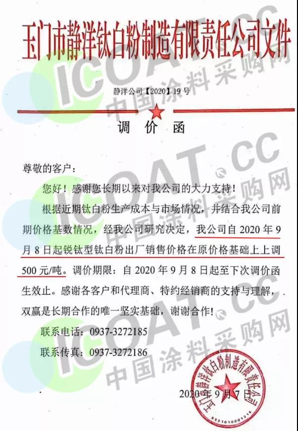 7日,玉門市靜洋鈦白粉制造有限責任公司發(fā)布調(diào)價函,稱自9月8日起,銳鈦型鈦白粉出廠銷售價格在原價格基礎上上調(diào)500元/噸。此前其曾在7月6日、8月7日發(fā)布過兩次調(diào)價函,這是第三輪調(diào)價,下半年累計漲價1600元/噸。