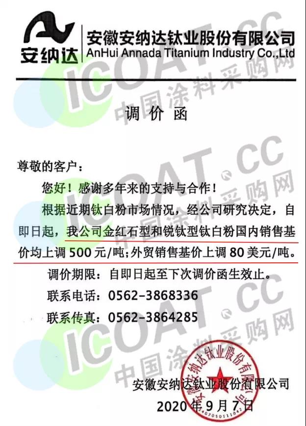 7日,安徽安納達鈦業(yè)股份有限公司發(fā)布調(diào)價函,稱自即日起,金紅石型和銳鈦型鈦白粉國內(nèi)銷售基價均上調(diào)500元/噸,外貿(mào)銷售基價上調(diào)80美元/噸。此前在7月10日其發(fā)布過漲價函,下半年兩輪漲價國內(nèi)價格累計上調(diào)1000元/噸,國外銷售價格上調(diào)160美元/噸。