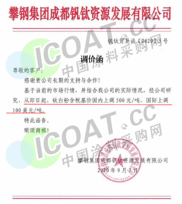 7日,攀鋼集團成都釩鈦資源發(fā)展有限公司發(fā)布調(diào)價函,稱即日起鈦白粉含稅基價國內(nèi)上調(diào)500元/噸,國際上調(diào)100美元/噸。