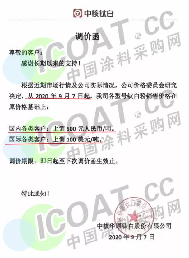 7日,中核華原鈦白股份有限公司發(fā)布調(diào)價函,稱自9月7日起,各型號鈦白粉銷售價格在原價格基礎上,國內(nèi)各類客戶上調(diào)500元人民幣/噸,國際各類客戶上調(diào)100美元/噸。此前在8月6日,其曾發(fā)布調(diào)價函,下半年兩輪調(diào)價,國內(nèi)客戶累計上調(diào)1000元/噸,國際客戶累計上調(diào)180元/噸。
