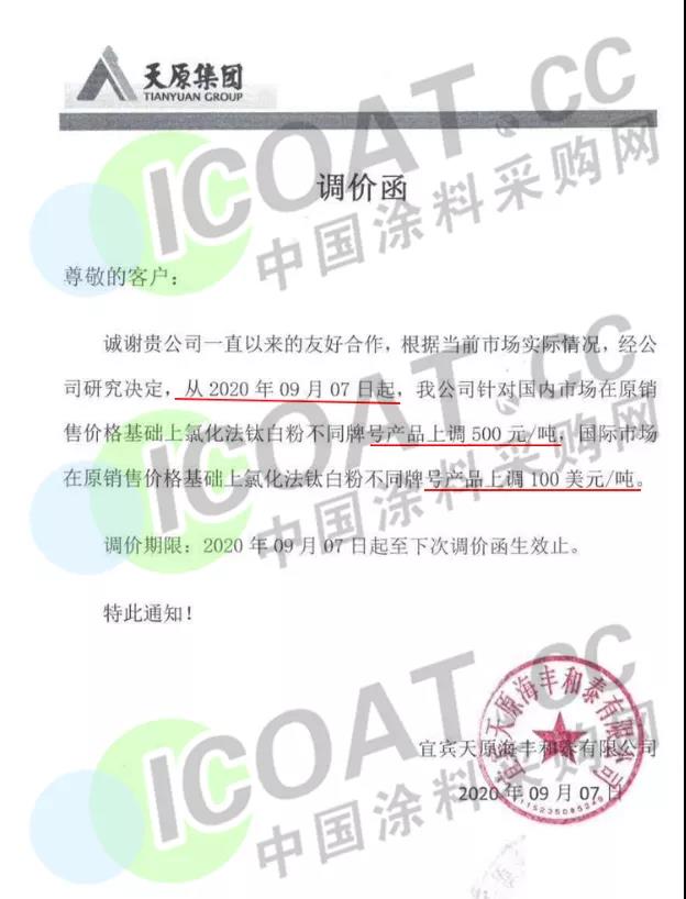 7日,宜賓天原海豐和泰有限公司發(fā)布調(diào)價函,稱自9月7日起,國內(nèi)市場氯化法鈦白粉不同牌號產(chǎn)品上調(diào)500元/噸,國際市場產(chǎn)品上調(diào)100美元/噸。此前在7月13日其曾發(fā)布過漲價函。下半年兩輪漲價,國內(nèi)市場價格上調(diào)1000元/噸,國際市場累計上調(diào)200美元/噸。