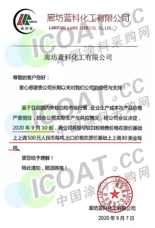 7日,廊坊藍科化工有限公司發(fā)布調(diào)價函,稱9月10日起,各型號鈦白粉銷售價格在原價基礎上上調(diào)500元/噸,出口價格在原價基礎上上調(diào)80美金/噸。此前在7月14日,其曾發(fā)布過漲價函。下半年兩輪漲價,國內(nèi)累計漲價1000元/噸,出口價格累計上漲160元/噸。