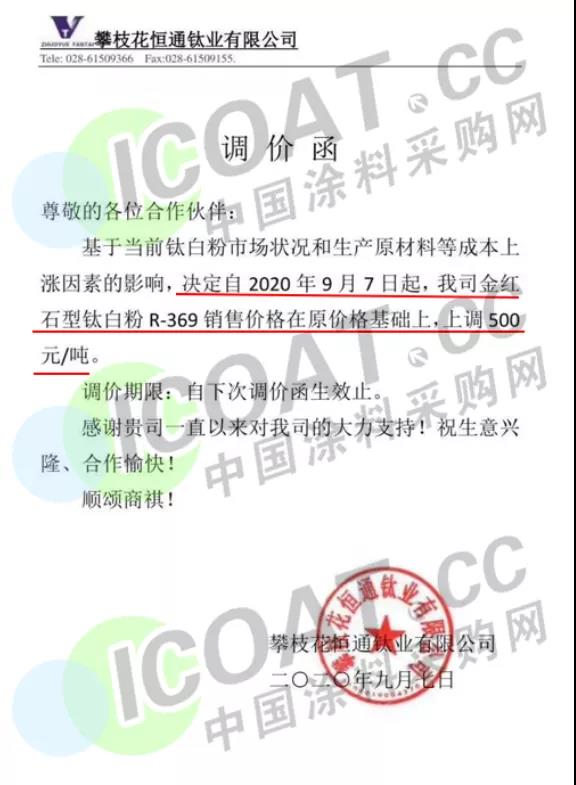 7日,攀枝花恒通鈦業(yè)有限公司發(fā)布調(diào)價函,稱9月7日起,金紅石型鈦白粉R-369銷售價格在原價格基礎上,上調(diào)500元/噸。此前其于7月13日發(fā)布漲價函,下半年兩輪累計漲價1000元/噸。