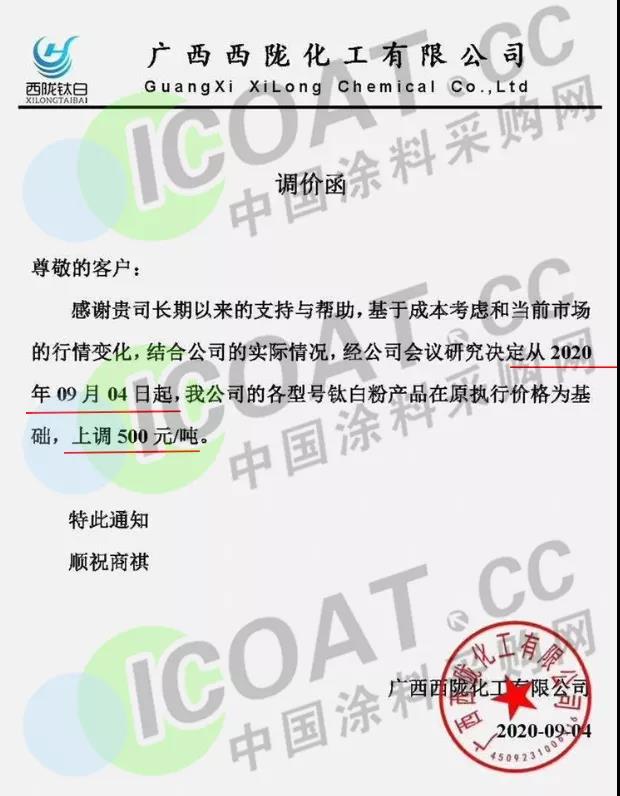 4日,廣西西隴化工有限公司發(fā)布調(diào)價函,稱自9月4日起,各型號鈦白粉產(chǎn)品在原執(zhí)行價格基礎上調(diào)500元/噸。此前在7月8日,其曾發(fā)布過漲價函。下半年兩輪漲價累計上漲1000元/噸。