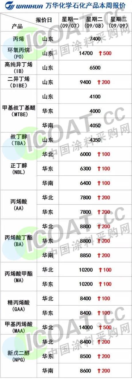 萬華化學7日報價,環(huán)氧丙烷山東區(qū)域上調(diào)500元/噸漲至14700元/噸;二異丁烯山東區(qū)域價格上調(diào)200元/噸漲至9400元/噸;正丁醇華北、華東、華南區(qū)域均上漲100元/噸,分別漲至6000元/噸,6300元/噸,6400元/噸;丙烯酸華北、華東區(qū)域均上漲200元/噸,均漲至7800元/噸;丙烯酸丁酯華北、華東、華南區(qū)域均上漲200元/噸,分別漲至8800元/噸,8800元/噸,8850元/噸;丙烯酸甲酯華北、華東區(qū)域均上漲100元/噸,漲至10200元/噸;精丙烯酸華北、華東區(qū)域均上漲100元/噸,漲至8400元/噸;甲基丙烯酸華北區(qū)域上漲500元/噸,漲至14000元/噸;新戊二醇華北、華東、華南區(qū)域均上漲200元/噸,分別漲至8400元/噸,8500元/噸,8600元/噸。