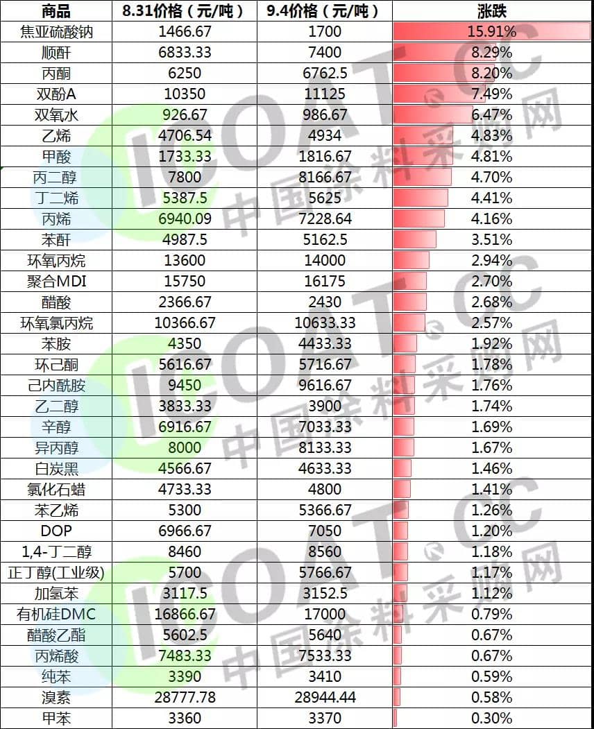 據(jù)涂料采購網(wǎng)不完全統(tǒng)計,在8月31日至9月4日的一周區(qū)間內(nèi),涂料采購網(wǎng)監(jiān)測的92種重要的化工原材料中,有35種原材料出現(xiàn)上漲趨勢,占比38.04%。漲幅榜前三甲分別為焦亞硫酸鈉(15.91%),順酐(8.29%),丙酮(8.20%)。相比前一周的數(shù)據(jù)來看,可謂是前三甲完全易主。