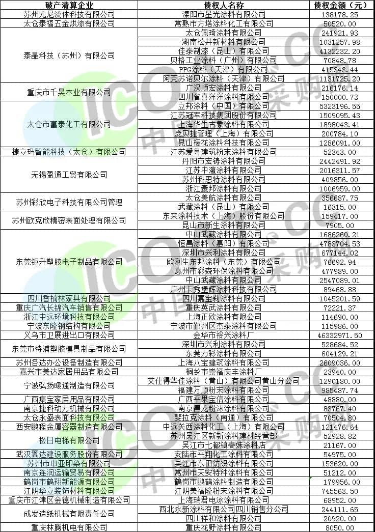 部分涂料企業(yè)債務(wù)人破產(chǎn)清算名單