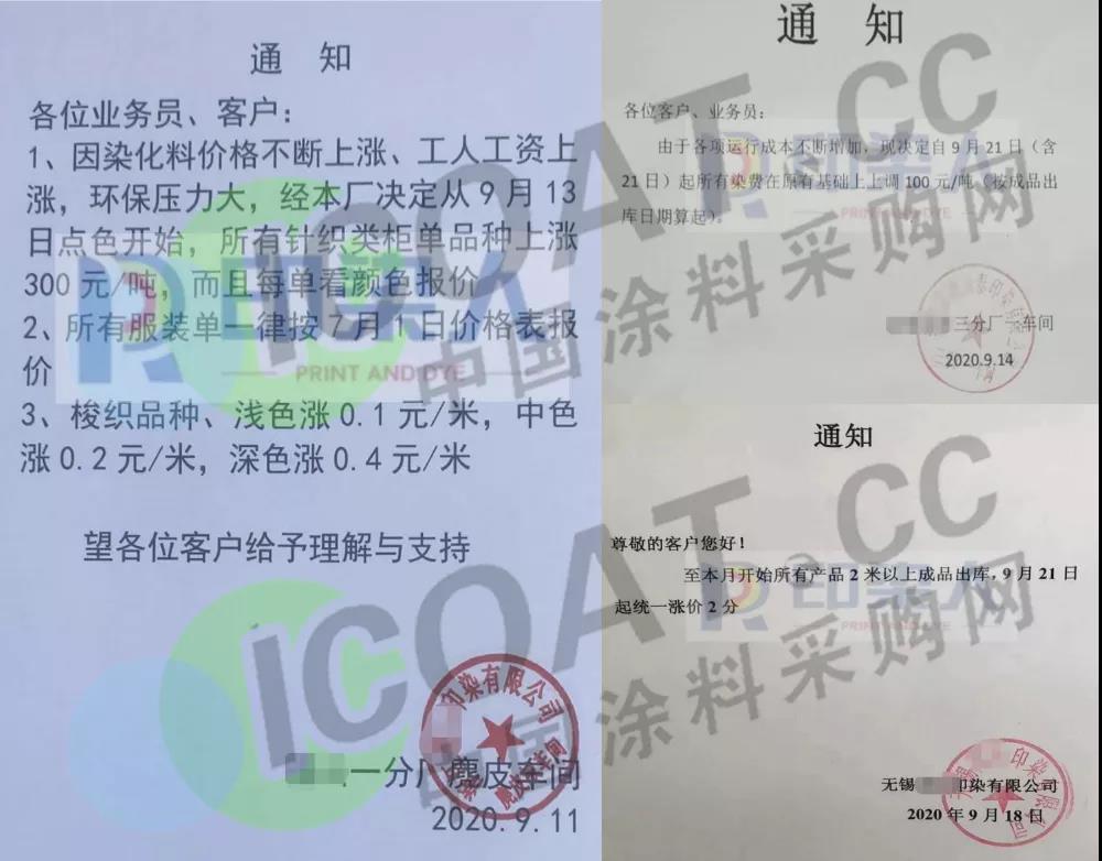 9月以來,印染行業上游,染料供應商傳出染料價格進行上漲調整。從分散染料到活性染料,大有一番上漲趨勢。染費在原有基礎上上調100元/噸;針織類柜單品種上漲300元/噸。