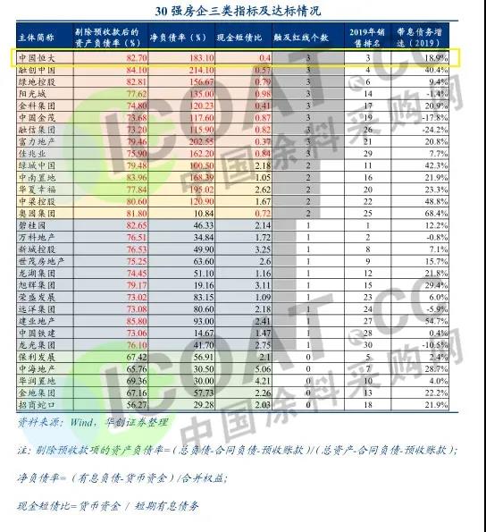 據(jù)相關(guān)數(shù)據(jù)統(tǒng)計(jì),以2019年報(bào)數(shù)據(jù)為基礎(chǔ), 在30強(qiáng)房企中,“三條紅線”均觸及的房企共有9家;滿足2個(gè)條件的有5家;滿足1個(gè)條件的11家;3 項(xiàng)均未觸及的共5家。