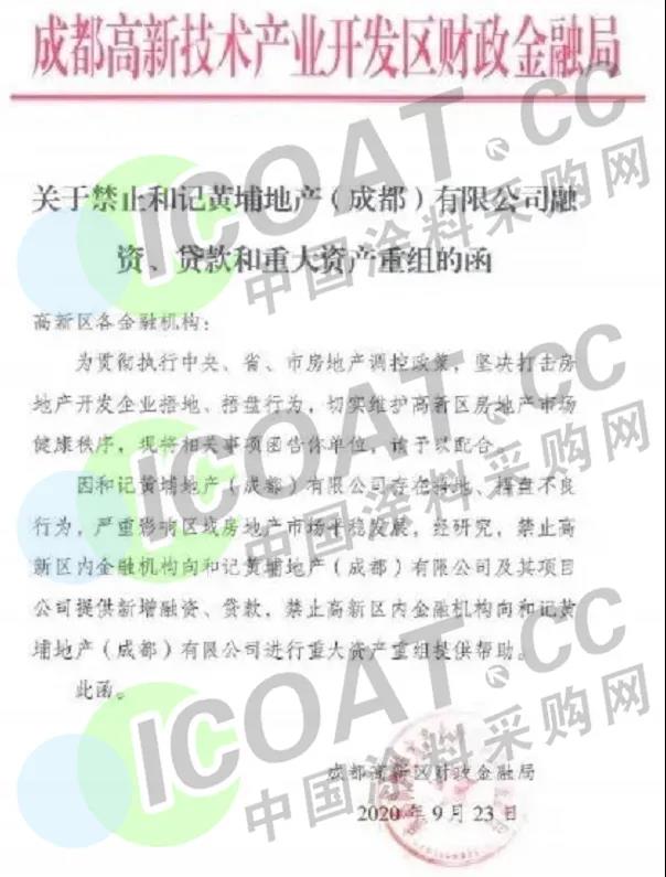 據(jù)涂料采購網(wǎng)了解,目前房地產(chǎn)行業(yè)日子不好過的不僅僅是恒大,李嘉誠旗下的和記黃埔地產(chǎn)最近遇到了很大的問題,日前,成都高新技術(shù)產(chǎn)業(yè)開發(fā)區(qū)財(cái)政金融局發(fā)布消息稱:因和記黃埔地產(chǎn)(成都)有限公司存在捂地、捂盤不良行為,嚴(yán)重影響區(qū)域房地產(chǎn)市場平穩(wěn)發(fā)展,經(jīng)研究,禁止高新區(qū)內(nèi)金融機(jī)構(gòu)向和記黃埔地產(chǎn)(成都)有限公司及其項(xiàng)目公司提供新增融資、貸款,禁止高新區(qū)內(nèi)金融機(jī)構(gòu)向和記黃埔地產(chǎn)(成都)有限公司進(jìn)行重大資產(chǎn)重組提供幫助。
