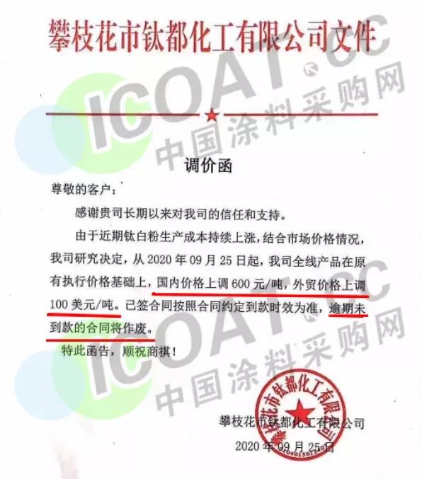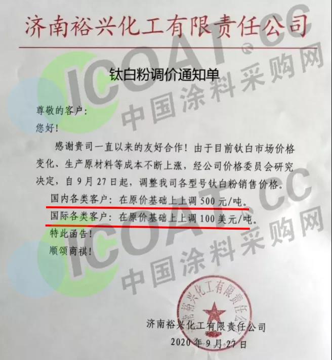 9月27日,濟南裕興化工發函通知,鈦白粉國內價格上調500元/噸,國際客戶價格上調100美元/噸。