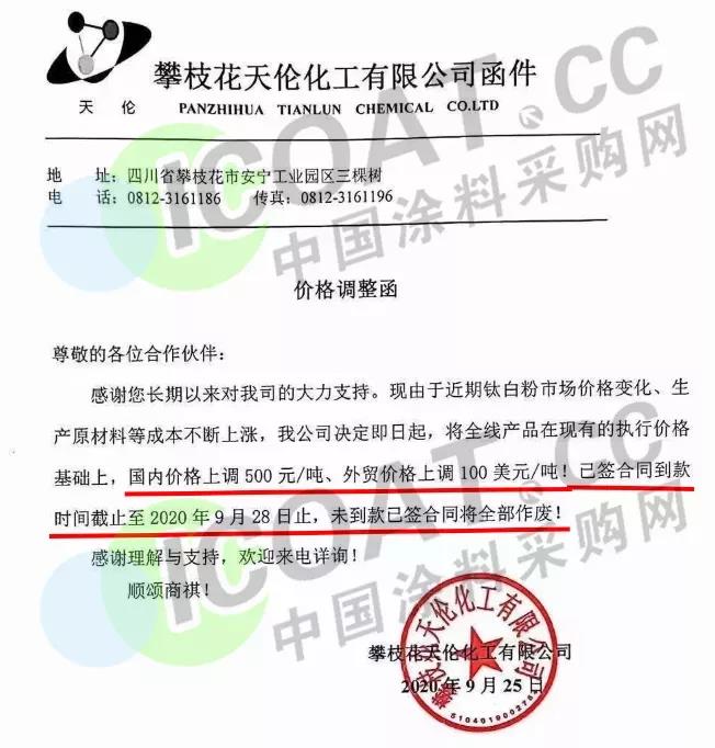 同日,攀枝花天倫化工國內價格上調500元/噸、外貿價格上調100美元/噸,已簽合同到款時間截止至2020年9月28日止,未到款已簽合同將全部作廢。