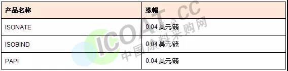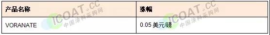陶氏化學宣布自10月1日或合同允許時間起,在北美地區提高VORANATE品牌TDI產品所有等級和包裝類型的價格,漲幅0.05美元/磅:
