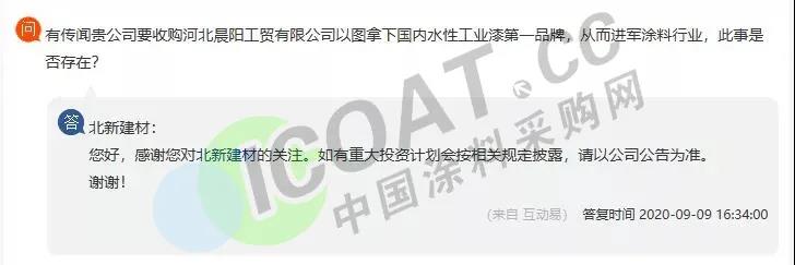 早在9月初,就有投資者在網(wǎng)絡(luò)平臺上向北新建材提問:有傳聞貴公司要收購河北晨陽工貿(mào)有限公司以圖拿下國內(nèi)水性工業(yè)漆第一品牌,從而進軍涂料行業(yè),此事是否存在?北新建材(SZ000786)董秘對此回答稱,感謝您對北新建材的關(guān)注。如有重大投資計劃會按相關(guān)規(guī)定披露,請以公司公告為準。