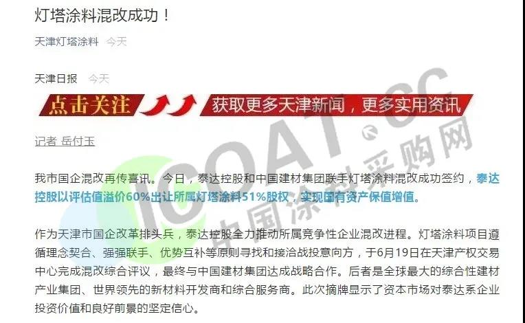 今年6月30日,中國建材已完成收購天津燈塔涂料工業(yè)有限公司51%的股權(quán),從而正式進軍工業(yè)涂料領(lǐng)域。