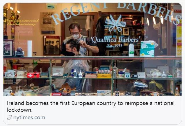 愛(ài)爾蘭總理米歇爾·馬丁20日宣布,自10月22日起再度全國(guó)“封城”6周,直到12月初。非必要經(jīng)營(yíng)場(chǎng)所一律關(guān)閉,超市、藥房、郵局和銀行等不受影響。餐館、咖啡館和酒吧僅限外賣(mài)服務(wù)。民眾外出活動(dòng)范圍僅限住所5公里范圍內(nèi)。