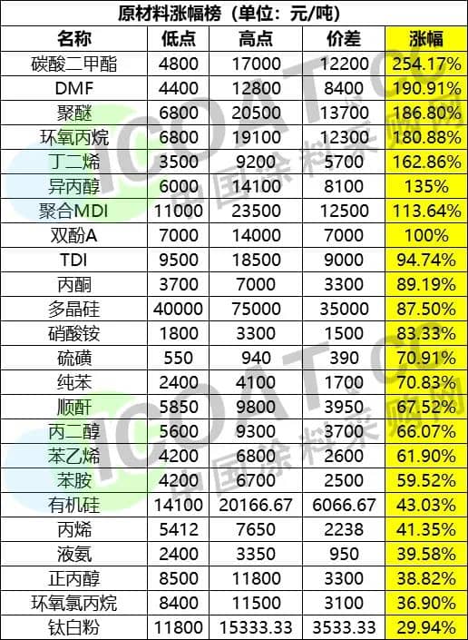 MDI漲幅113.64%,巨頭發函調漲5400元/噸。