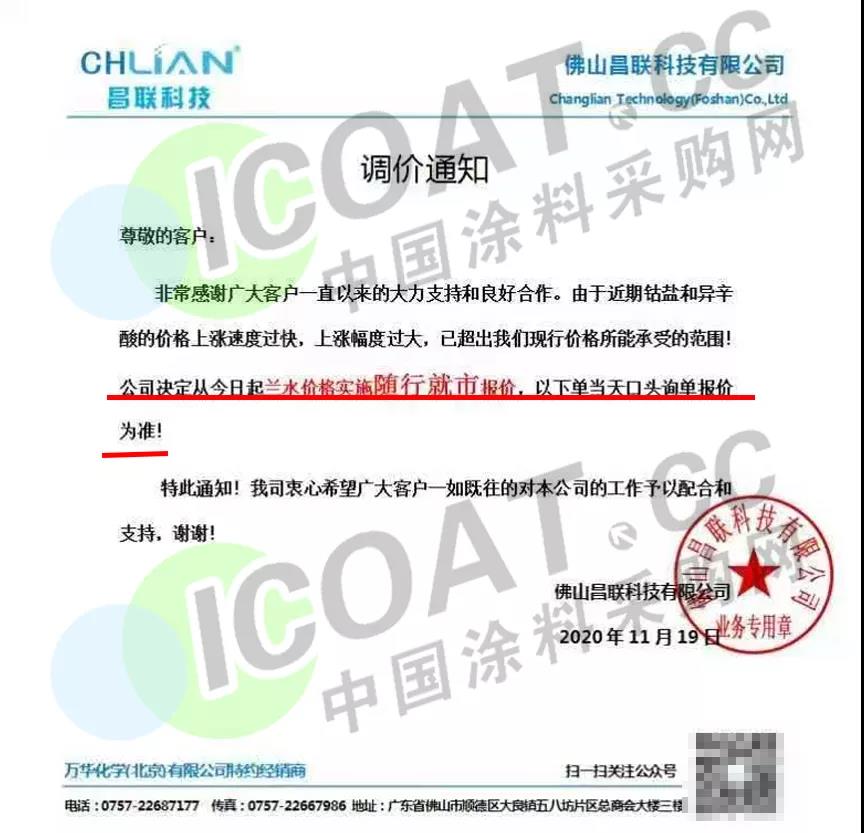 11月19日,萬華化學(北京)有限公司特約經銷商——佛山昌聯科技有限公司發函,稱蘭水價格實施隨行就市報價,以下單當天口頭詢單報價為準。