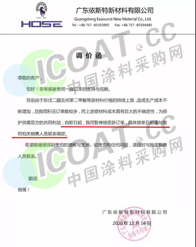 11月13日,湛新樹脂發函,稱由于積壓訂單數較多,上游原材料成本具有巨大不確定性,即日起暫停接收新訂單。具體重新開放接收訂單日期,請與銷售人員聯系確定。
