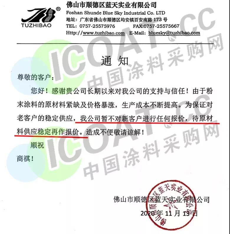 11月13日,佛山市順德區藍天實業有限公司發函,稱由于粉末涂料的原材料緊缺及價格暴漲,生產成本不斷提高。為保證對老客戶的穩定供應,暫不對新客戶進行任何報價,待原材料供應穩定再作報價。